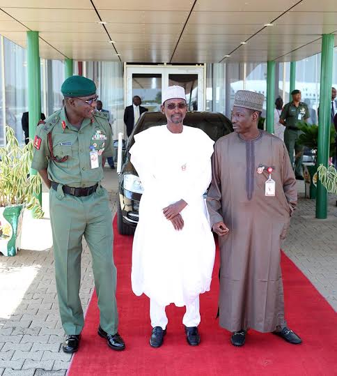 He is accompanied by by the Minister of Foreign Affairs, Geoffrey Onyeama, the Minister of Environment, Amina Mohammed and the National Security Adviser, Maj.-Gen. Babagana Monguno (rtd.)